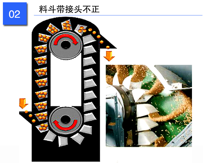 料斗帶接頭不正是指料斗帶結(jié)合后,料斗帶邊緣線不在同一直線上。工作時,料斗帶一邊緊一邊松,使料斗帶向緊邊側(cè)向移動,產(chǎn)生跑偏,造成料斗盛料不充分,卸料不,回料增多,生產(chǎn)率下降,嚴(yán)重時造成料斗帶卡邊、撕裂。