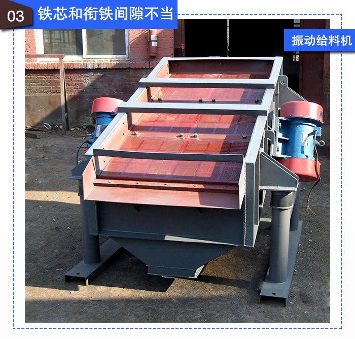 給料機鐵芯和銜鐵之間的間隙過大或者過小造成的,若出現(xiàn)這種情況,都會因機器達不到正常的振幅而影響給料機的給料。