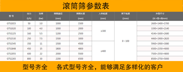大漢作為專業的滾筒篩生產廠家,積累了大量的生產經驗和技術,能夠生產的滾筒篩型號和種類多種多樣,滿足各種各樣的用戶需求,并且可以在客戶提出特殊的需要時,也完全有能力設計出適合客戶的方案,定制其需要的產品。