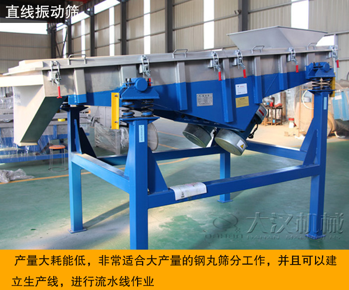 直線振動篩采用振動電機激振作為振動源,使物料在篩網(wǎng)上被拋起,同時向前做直線運動,物料從給料機均勻地進(jìn)入篩分機的進(jìn)料口,通過多層的篩網(wǎng)產(chǎn)生多種規(guī)格的篩上物、篩下物,分別從各自的出口排出。直線振動篩可以分離多種規(guī)格的鋼丸。適用于對其篩選和分級。